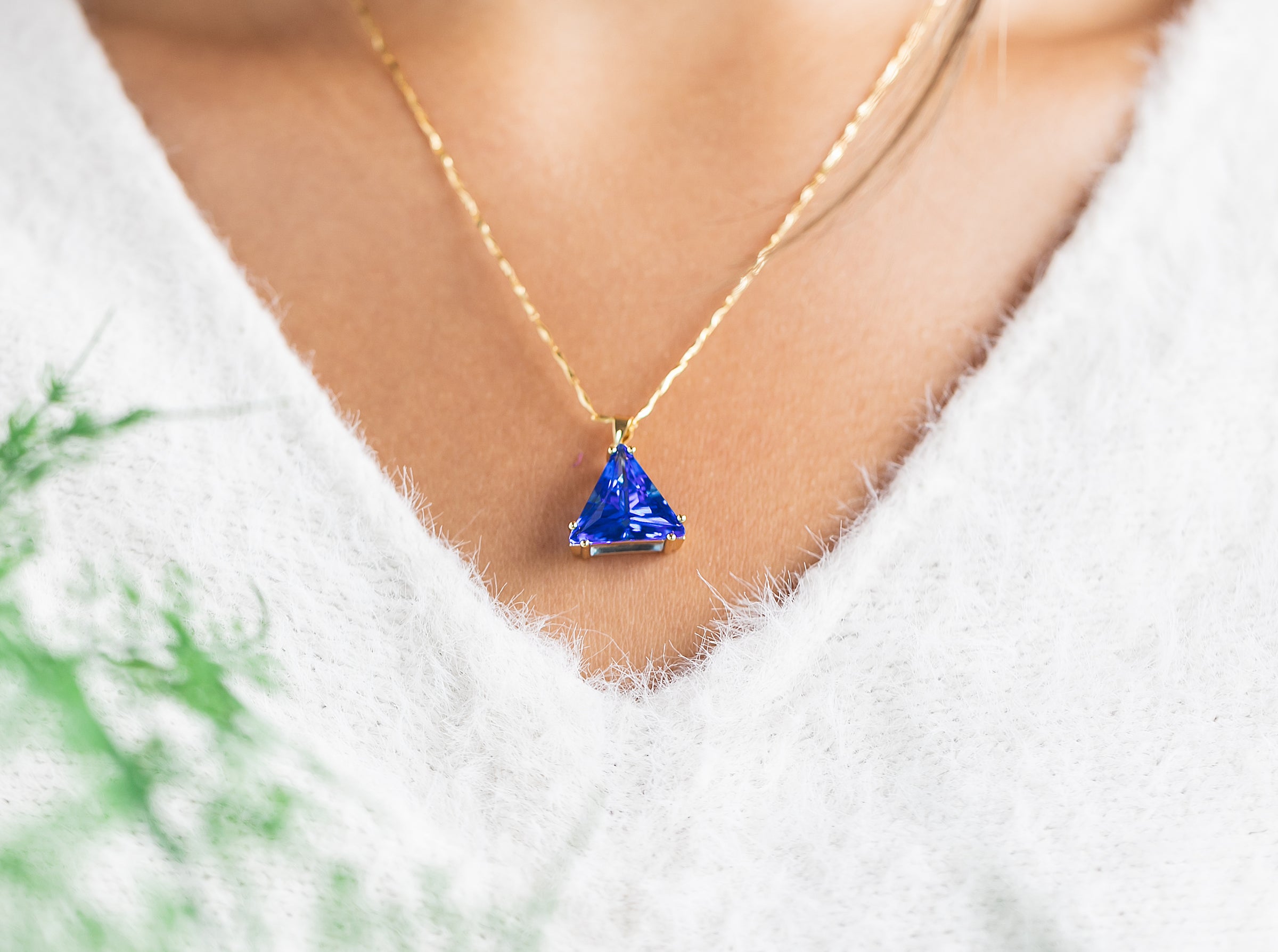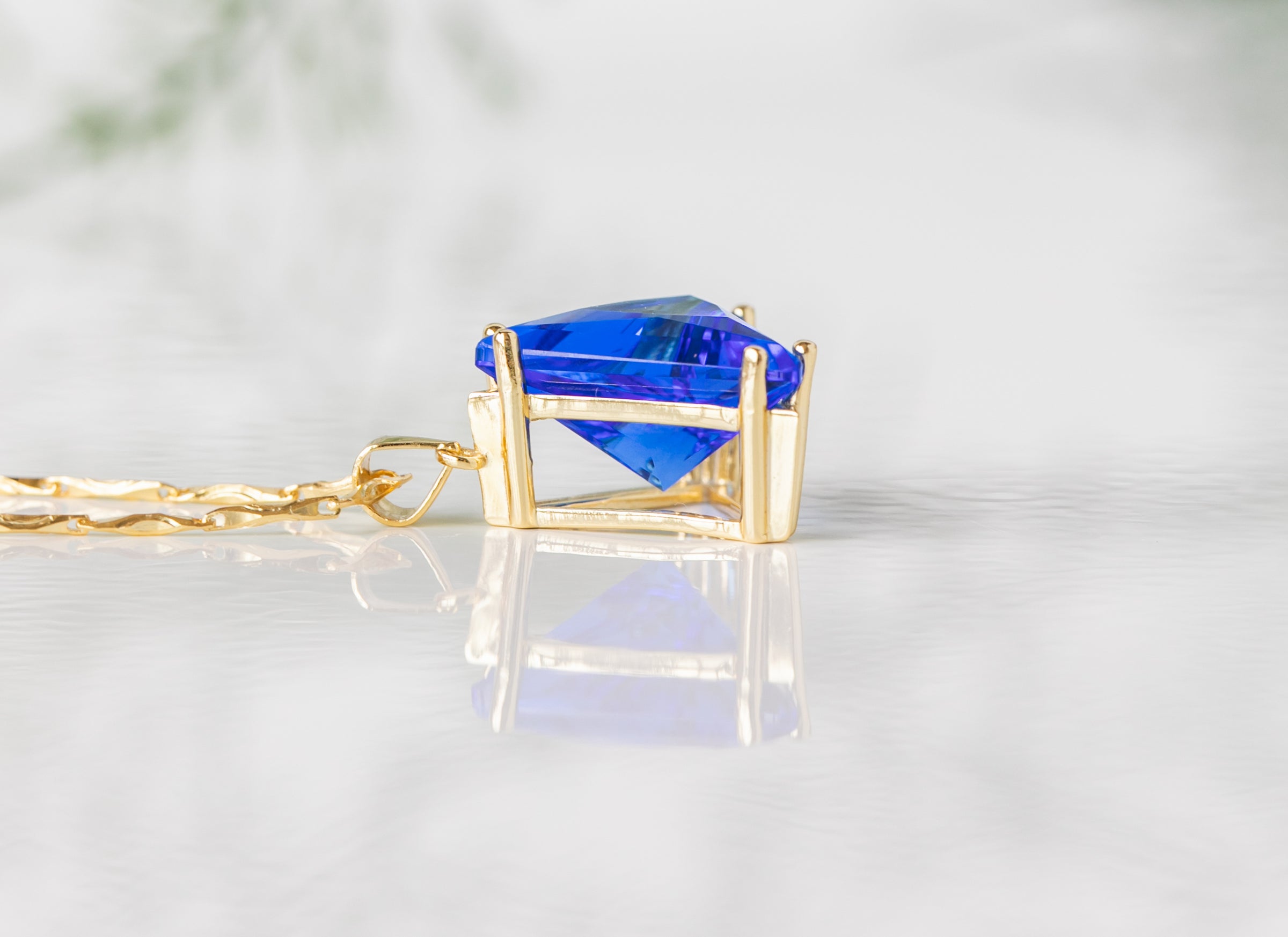 The Siberian Blue Quartz pyramid pendant reflects brilliant light, giving the stone a kaleidoscopic appearance. There is no other gemstone that so strikingly exhibits such blue rays as the Siberian Blue Quartz.